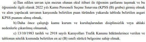 Son olarak kamuoyuna açıklanan ilan metniyle adayların Kamu Personeli Seçme Sınavı'ndan asgari 65 puan almış olmaları ve diğer bazı özel koşulları yerine getirmeleri gerekmektedir. İlgili pozisyonlar için aylık maaşların 28 bin ile 39 bin Türk Lirası arasında değiştiği ifade edilmiştir.