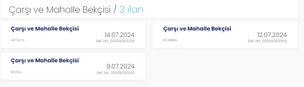 Çarşı ve Mahalle Bekçisi alımı için şu anda Antalya, Muğla ve İstanbul illerinde alımlar devam etmektedir. Ayrıca, normal bekçi alımı için 94 bekçi alım ilanı bulunmaktadır. Şartlara ve başvuracağınız ile göre filtreleme yaparak ilanları görüntüleyebilirsiniz.