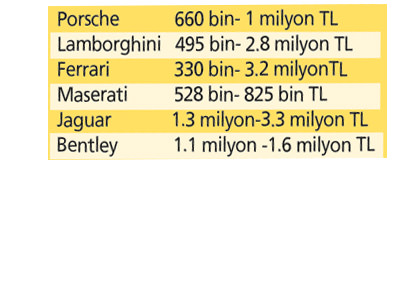 Lüks segmentindeki araçlar Türkiye'deki fiyatlarıyla da dudak uçuklatıyor. Euro olarak satılan araçların fiyatları milyon liraları bulurken vergileriyle de orta segment bir araç alınabiliyor. Bu yüzden araçların fiyatları Avrupa'ya göre bizde daha yüksek çıkıyor. Lüks araçların bazılarının Türkiye'deki ortalama satış rakam aralıkları şöyle:
