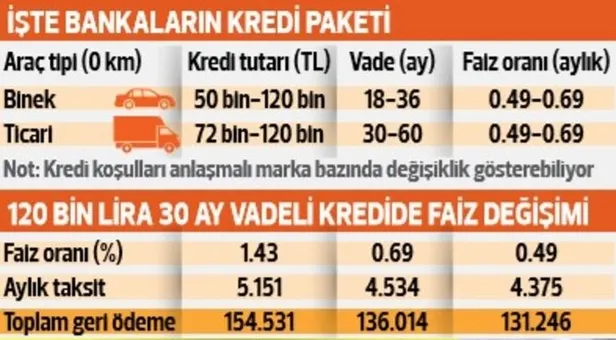 Üç kamu bankasının taşıt kredisi paketi firmaya göre değişebilecek. Bir firma 50 bin liraya kadar yüzde 0.49 faiz verirken, diğer bir firma 0.69 faizle kredi kullanabilecek. Ziraat Bankası'nın şu anda taşıt kredileri için faiz oranı aylık yüzde 1.43. Vakıfbank'ta yüzde 1.45, Halkbank'ta ise yüzde 1.42 aylık faiz uygulanıyor. Ziraat Bankası'nın uyguladığı yüzde 1.43'lük faize göre 120 bin TL'lik 30 ay vadeli bir kredide aylık taksit 5 bin 151 liraya denk geliyor. Geri ödeme toplamda 154 bin 531 liraya ulaşıyor. Faiz 0.49 olduğunda aylık taksit 4 bin 375 liraya, toplam ödeme de 131 bin 246 liraya geriliyor. Kredi aylık faizi yüzde 0.69 olursa taksit aylık 4 bin 534 liraya denk geliyor. 30 ay sonunda kredi toplam 136 bin 14 lira olarak geri ödeniyor.