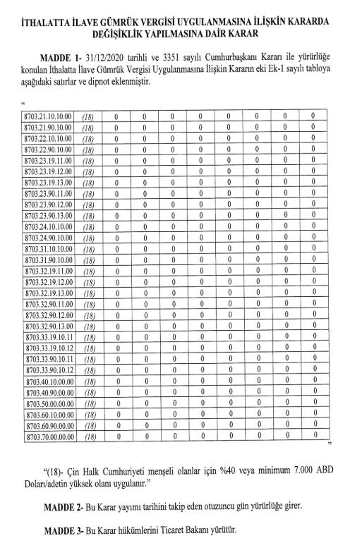 Söz konusu gelişmeler ışığında yerli üretimin iç pazardaki düşen payının yükseltilmesi ve korunmasını teminen, dış ticaret dengesine ilişkin gelişmeler ile cari açık hedefler dikkate alınarak, aynı zamanda yurt içinde yatırım ve üretimi teşvik amacıyla, 8703 Gümrük Tarife Pozisyonu altında sınıflandırılan konvansiyonel (içten yanmalı) ve hibrit binek otomobillerin Çin menşeli olanlarının ithalatında 'İthalat değerinin yüzde 40'ı veya 7 bin dolar/adetin yüksek olanı uygulanır.' şeklinde ilave gümrük vergisi uygulanması kararlaştırıldı.