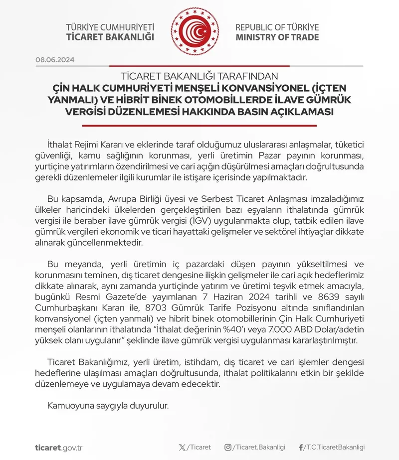 Resmi Gazete'de yayımlanan düzenleme ile Çin'den ithal edilen tüm yakıt tiplerindeki binek araçlara ilave yüzde 40 vergi getirildi. Karar, 30 gün sonra yürürlüğe girecek. Konuyla ilgili Ticaret Bakanlığı'nın sosyal medya hesabından, "Çin Halk Cumhuriyeti menşeli konvansiyonel (içten yanmalı) ve hibrit binek otomobillerde ilave gümrük vergisi düzenlemesi hakkında basın açıklaması" başlığıyla bir açıklama yapıldı. Bakanlıktan yapılan açıklamada, "Ticaret Bakanlığımız, yerli üretim, istihdam, dış ticaret ve cari işlemler dengesi hedeflerine ulaşılması amaçları doğrultusunda, ithalat politikalarını etkin bir şekilde düzenlemeye ve uygulamaya devam edecektir." ifadelerine yer verildi.