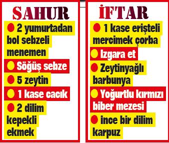 İftariyeliklerle oruç açıldıktan sonra çorba için 15 dakika beklenmeli. Ana yemek olarak ızgara, haşlanmış ya da fırınlanmış et, tavuk veya balık tercih edilmeli. Aksi halde şeker ve tansiyon yükselip, kalp rahatsızlıkları riski artar. Tatlı krizine girenler de sütlü tatlı yemeli. Yemekten 1 saat sonra meyve ve cevizle yapılacak ara öğün kan şekerini dengeler.