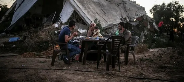 Filistinli Şahin ailesi üç yıldır, İsrail'in Temmuz 2014'te Gazze'ye düzenlediği saldırılar sırasında yıkılan evlerinin yanında, hala kaldırılmayı bekleyen enkazların arasında iftar ediyor.