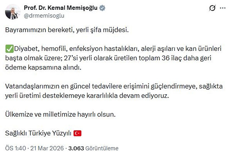 Bakan Memişoğlu, paylaşımına "Bayramımızın bereketi, yerli şifa müjdesi" başlığını vererek, sağlıkta yerlileşme vurgusu yaptı. Sağlık Bakanı Kemal Memişoğlu, diyabet, hemofili, enfeksiyon hastalıkları, alerji aşıları ve kan ürünleri başta olmak üzere 36 ilacın geri ödeme kapsamına alındığını bildirdi.