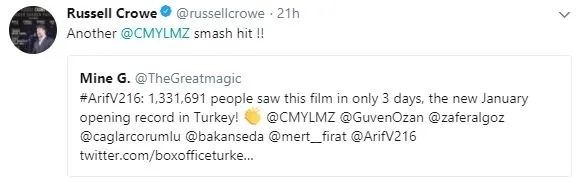 'Son Umut' filminde Cem Yılmaz'la oynayan Russel Crowe'dan 'Arif V 216'ya destek... Dünyaca ünlü yıldız, Twitter'da "Cem Yılmaz, yine isabet ettirdi" diye yazarak Yılmaz'ı gururlandırdı.