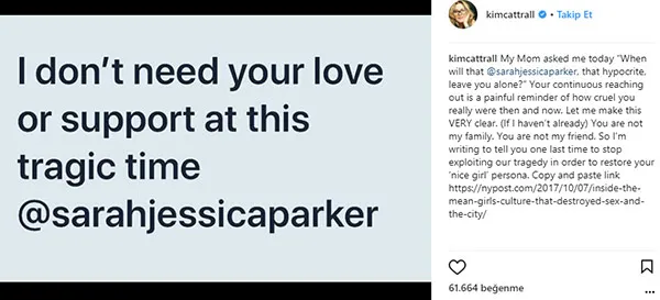 Sabah Gazetesi'nde yer alan habere göre; olayın ardından Sarah Jessica Parker, instagram'da Cattrall'a başsağlığı diledi. Ancak ünlü oyuncunun, Parker'ın mesajına cevabı hayli sert oldu.