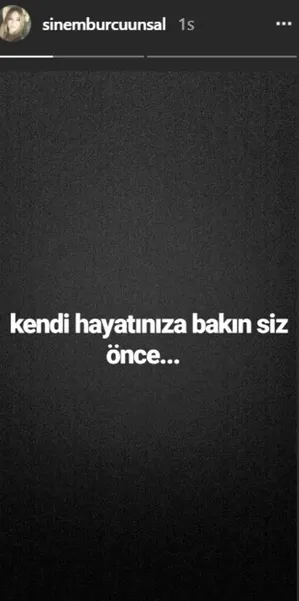 İhanetten adı geçen ve konu hakkında herhangi bir açıklama yapmayan Burcu Sinem Ünsal, bugün Instagram hesabından kendisinin çektiği fotoğrafını paylaştı. Fotoğrafın altına gelen yorumları okuyan Burcu Sinem Ünsal, Instagram'ın hikaye kısmından "Kendi hayatınıza bakın siz önce... Her şeyin bir açıklaması vardır bu hayatta" dedi.