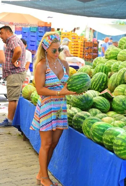 Taze meyve-sebze almak için pazara giden Burcu Hanım'ın pazar şıklığı dikkatimi çekti! Hoş, aslında renkli stiliyle hem yaz mevsimine çok uygun, hem de Bodrum'un sıcak havasında rahat etmesini sağlayacak bir kombin tercih etmiş.