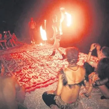 Partiye sevgilisi Mert İncekara ile katılan Kalpakçıoğlu da konsepte uyarak tütü giydi. Hava karardıktan sonra kumsala otantik bir halı serip ateş gösterileri izleyen sosyetikler, eğlencenin doruğuna çıktı. İki günlük organizasyonun sonunda en çılgın kostümleriyle toplu hatıra fotoğrafı çektiren sosyetiklerin bu görüntüsü, ne ABD'deki Burning Man Festivali'ni de Afrika'daki kabileleri aratmayacak cinstendi.