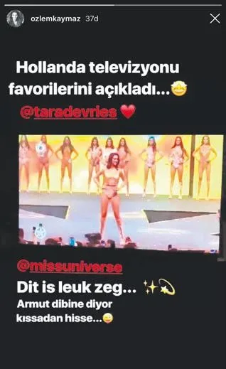 Hollanda televizyonlarında kızının Miss Universe favorileri arasında gösterilmesiyle gururlanan Özlem Kaymaz da haberleri Instagram'da paylaştı. Kaymaz, Hollanda basınının kendisi ve kızı için yaptığı haber için de "Kıssadan hisse; armut dibine diyor" yorumu yaptı.