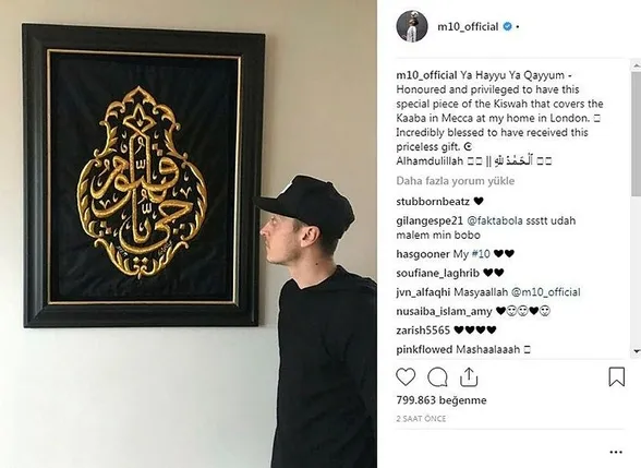 Arsenal'de oynayan Mesut Özil, dün Instagram'da bu anlamlı kareyi paylaştı. Fotoğrafın altına da şunları yazdı: "Mekke'deki Kabe'yi kapsayan bu özel Kiswah eserini Londra'daki evimde kullanmak bir onur ve ayrıcalık. Elhamdülillah."