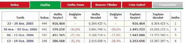 Filmin gösterildiği sinema salonu sayısı üçüncü haftada 912'ye düştü. İlk üç günde 1 milyon 496 bin 857 kişinin izleyerek rekor bir açılışa imza attığı filmin izlenme rakamı ikinci haftada ise yüzde 27'lik düşüşle 1 milyon 82 bin 373 kişide kaldı.