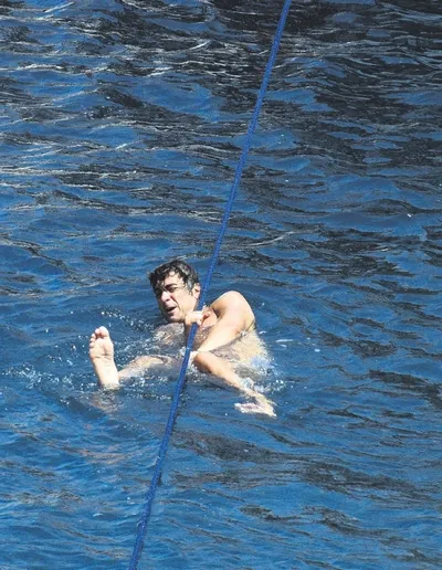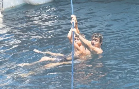 Bir ara teknenin halatına tutunup su jimnastiği yapan Kutluay'ın bu hali güldürdü.