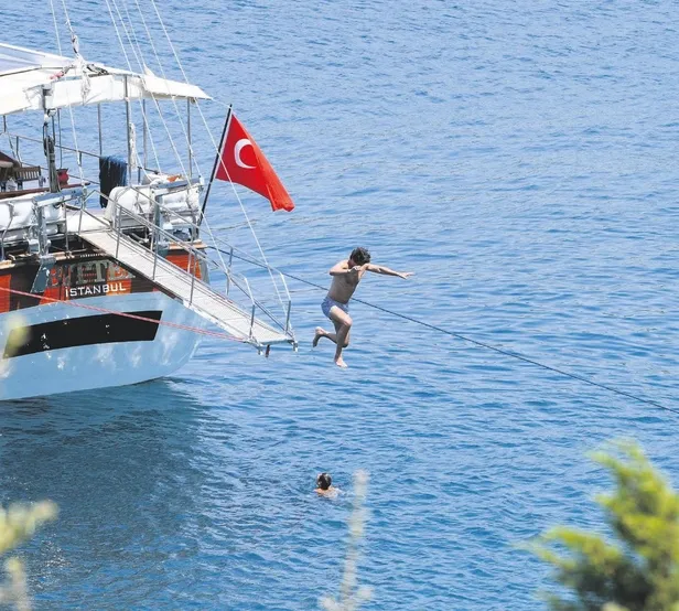 Kutluay, günlük kirası 850 euro (5 bin 500 lira) olan 21 metrelik gulet tekneden oğlu Ömer'le arka arkaya artistik atlayışlar yapıp eğlenceli anlar yaşadı.