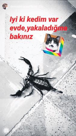 Akrebin fotoğrafını sosyal medya hesabında paylaşan ünlü sanatçı, "İyi ki kedim var evde, yakaladığımıza bakın" ifadelerini kullandı.