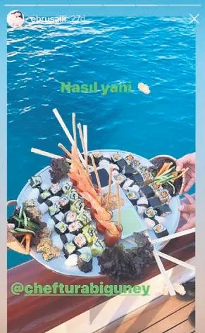 Şallı'ya ablası Funda ile aile dostları da eşlik etti. Ünlü çift, teknede güzel bir ziyafet de çekti.