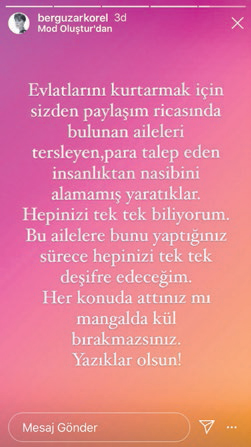 Bergüzar Korel, Instagram hesabının hikaye bölümünden yapılan bu vicdansızlığı ifşa etti ve o kişileri tanıdığını söyledi.