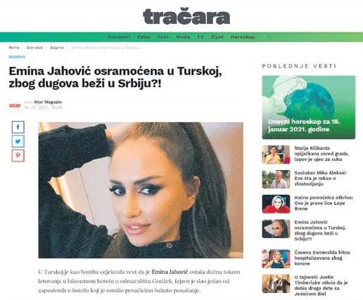 Göcek’teki bir otele borcunu ödemediği iddia edilen Emina Jahovic için ülkesindeki gazeteler, ‘Utanıp Türkiye’den kaçtı’ diye yazdı. Türk basınından şikayet eden Emina Jahovic hakkında ülkesindeki gazeteler de her gün ayrı bir iddiada bulunuyor.