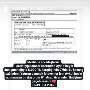 Kardelen Acar'ın hesabından tıpkı geçtiğimiz günlerde Nuri Alço'da olduğu gibi 'Merhaba arkadaşlar; Forex uygulaması danışmanlığında Aykut beyin danışmanlığında 5.000 TL karşılığında 97 bin TL kazanç sağladım" mesajı paylaşıldı.