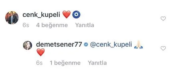 Eski eşinin jestini karşılıksız bırakmayan Demet Şener de, Küpeli'ye kalp emojisiyle yanıt verdi. Şener ile Cenk Küpeli'nin sosyal medyadaki bu karşılıklı yazışması, "Ayrılsalar da kalpleri bir" dedirtti.