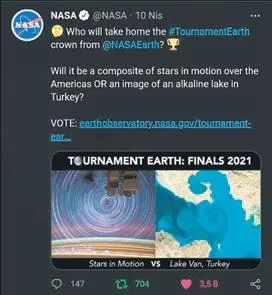 ABD Havacılık ve Uzay Ajansı'nın (NASA) düzenlediği 'Dünya Turnuvası' adlı online fotoğraf yarışmasında finale kalan Van Gölü'nün uzaydan çekilen fotoğrafı için oy seferberliği başlatıldı.