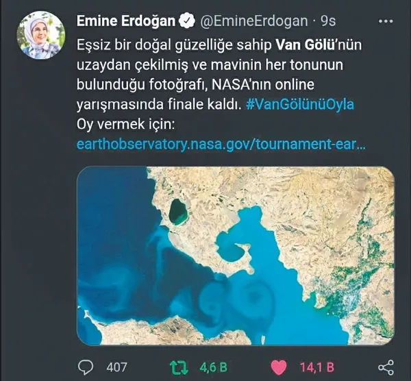 Başkan Recep Tayyip Erdoğan'ın eşi Emine Erdoğan başta olmak üzere İçişleri Bakanı Süleyman Soylu ve Kültür ve Turizm Bakanı Mehmet Nuri Ersoy gibi birçok devlet erkanı, Van Gölü'nün uzaydan çekilen fotoğrafı için oy kullanıp, destek istedi.