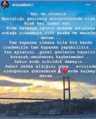 Geçtiğimiz haftalarda Beyberbeyi'ndeki 20 milyon dolarlık Mabeyinci Faik Bey Yalısı'ndan yaptığı "Evde durmaktan sıkılmayın, evden dışarı çıkmayın, kendi tam kapanmamızı kendimiz yapalım" paylaşımıyla beklenmedik bir tepkiyle karşılaşan Arzu Sabancı'ya ikinci şok.
