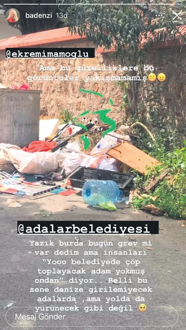 Büyükada’da yaşayan annesini ziyarete giden Bade İşçil, gördükleriyle şoke oldu. Güzelim adalarda her köşe başında çöp yığınlarını gören oyuncu, “Ama bu güzelliklere bu görüntüler yakışmamış. Belediyede çöp toplayacak adam yokmuş diyorlar. Belli bu sene denize girilmeyecek adalarda, ama yolda da yürünecek gibi değil” diyerek tepki gösterdi.