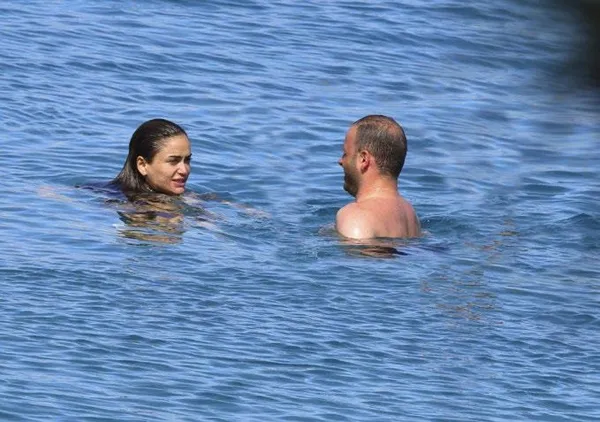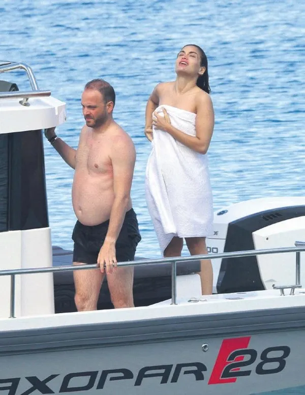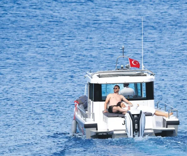 Murat Bey de fotoğrafları çektikten sonra denize atlayarak eşiyle birlikte yüzdü. Yeni evli çift, daha sonra birlikte bota çıkarak aşk dolu anlar yaşadı. Görüntülendiklerinden habersiz olan çiftin romantik anları objektiflere yansıdı.