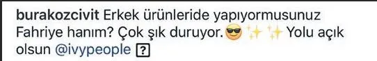 Eşine destek veren Özçivit, sosyal medya hesabından Fahriye Evcen'in reklam videosunu paylaşarak, "Erkek ürünleri de yapıyormusunuz Fahriye Hanım? Çok şık duruyor" notu düştü.