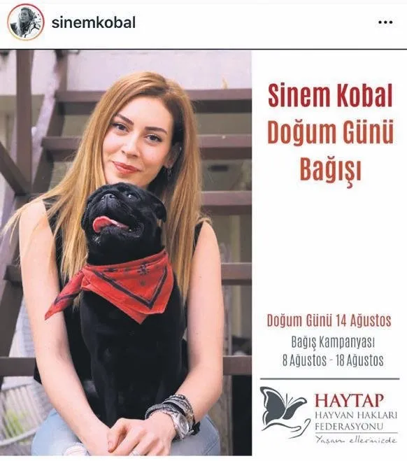 Sinem Kobal, 14 Ağustos'taki doğum günü için sevenlerine çağrı yaptı. Güzel oyuncu, doğum gününde hediye yerine HAYTAP'a (Hayvan Hakları Federasyonu) bağış yapılmasını istedi. Kobal, "Bağışlarınızın bir canlı için fayda sağlaması, bana hediyelerin en güzeli olur" dedi.