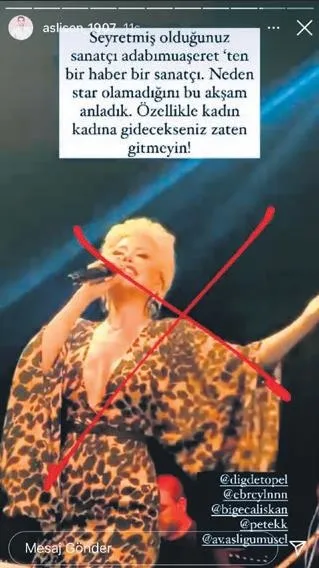 Aslı Şen, bir grup kadın arkadaşıyla Linet’i dinlemeye gitti. Mekanda en ön masaya yerleşti. Ancak beklediği ilgiyi göremeyince sinirlendi. Linet’in üzerine çarpı koyduğu bir fotoğrafı paylaşıp şarkıcıyı topa tuttu.