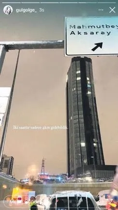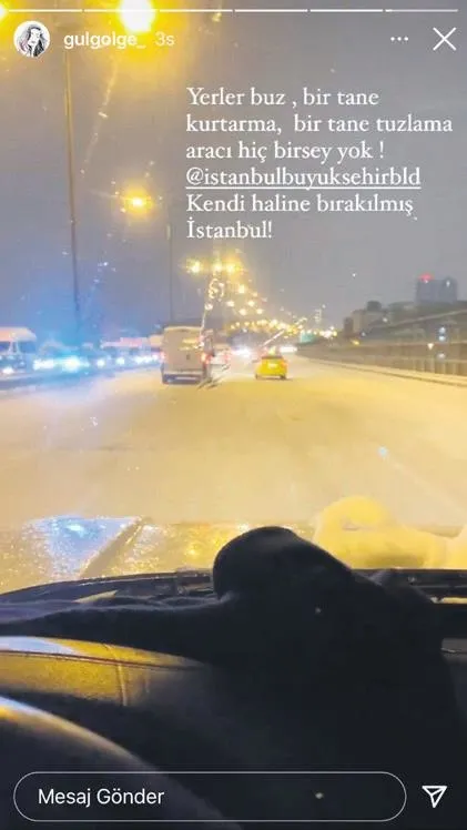 Arabasının içinde paylaşımlar yapan Gölge, önce "2 saatte sadece 4 kilometre gidebildik" diyerek tepki gösterdi. Beklemeye devam edince sinirlenen sosyetik güzel, "Yerler buz, bir tane kurtarma, bir tane tuzlama aracı, hiçbir şey yok. İstanbul Büyükşehir Belediyesi İstanbul'u kendi haline bırakmış" diyerek sosyal medyadan isyan dolu paylaşım yaptı.