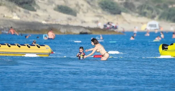 Ünlü oyuncu Hazal Kaya, oğlu Fikret Ali ve kızı Leyla Süreyya ile Çeşme’de