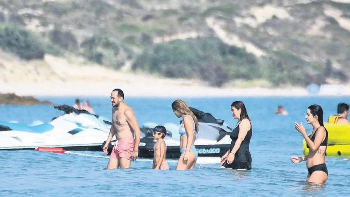 Oğulları Güney ile birlikte her yaz Çeşme'ye tatile giden Sarp ve Bengisu Apak çiftinin adresleri bu sene de değişmedi. Çiftlikköy'de bir beache giden Apak ailesi, denizde serinlerken yaptıkları küçük bir yarışla günlerine renk kattı. Oğluyla önden suya girip açılışı yapan ünlü oyuncu, daha sonra yanlarına gelen eşi ile yüzme yarışı yaptı.