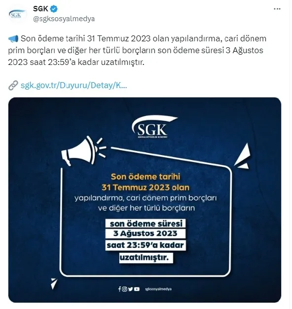 Son ödeme tarihi 31 Temmuz 2023 olan yapılandırma, cari dönem prim borçları ve diğer her türlü borçların son ödeme süresi 3 Ağustos 2023 saat 23:59'a kadar uzatılmıştır. SGK'nın resmi sosyal medya hesabı olan Twitter üzerinden yapılan duyuru, borçluları bilgilendirmek ve son başvuru tarihini hatırlatmak amacıyla yapılmıştır.