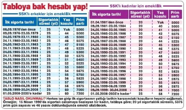 1999 2000 2008 Arası Sonrası Emeklilik Tablosu