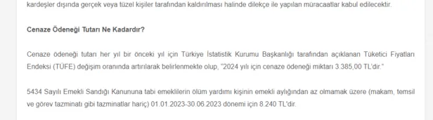 2024 yılı için cenaze yardımı miktarı, TÜFE değişim oranı göz önünde bulundurularak 3.385 TL olarak belirlenmiştir. Emekli Sandığı emeklileri için ise bu miktar en az 8.240 TL'dir. Ancak bu rakamlar SGK tarafından güncellenebilir.