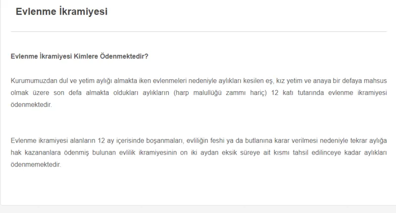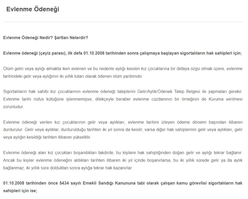 SGK, ölüm geliri veya aylığı alan kız çocuklarına evlenmeleri durumunda "evlenme ödeneği" sağlamaktadır. Halk arasında çeyiz parası olarak da bilinen bu ödeme, evlenecek kız çocuklarının düğün masraflarını bir nebze olsun hafifletmek için tasarlanmıştır. Evlenme ödeneği alabilmek için gereken tek şart, hayatını kaybetmiş bir ebeveyn üzerinden yetim aylığı almaktır.