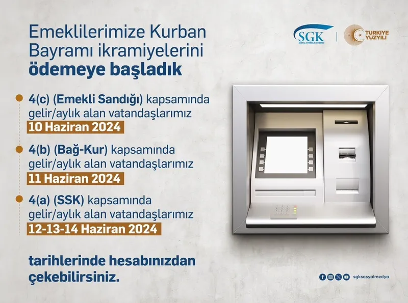 4 (a) (SSK) kapsamında gelir/aylık alanların Kurban Bayramı ikramiyeleri 12-13-14 Haziran 2024 tarihlerinde ödenecek.