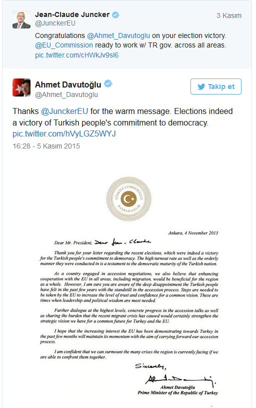 Başbakan Ahmet Davutoğlu, AK Parti'nin 1 Kasım'daki seçim zaferiyle ilgili Avrupa Birliği (AB) Komisyonu Başkanı Jean-Claude Juncker'in kendisine yazdığı mektup ve Twitter'da yayınladığı tebrik mesajına yanıt verdi.