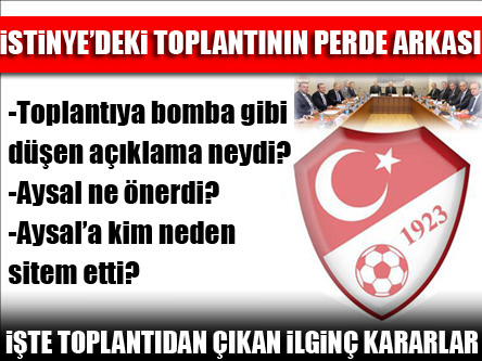 Süper Lig'in 9 Eylül'e ertelenmesinin ardından TFF dün İstinye'deki binasında Süper Lig ve Bank Asya kulüpleri ile bir toplantı gerçekleştirdi. Toplantıda şike skandalının ardından neler yapılacağı enine boyuna tartışıldı. Açılış konuşmasını yapan Mehmet Ali Aydınlar çok ağır bir durumla karşı karşıya olduklarını belirterek "El ele verip en doğru çıkış yolunu bulacağız" dedi...