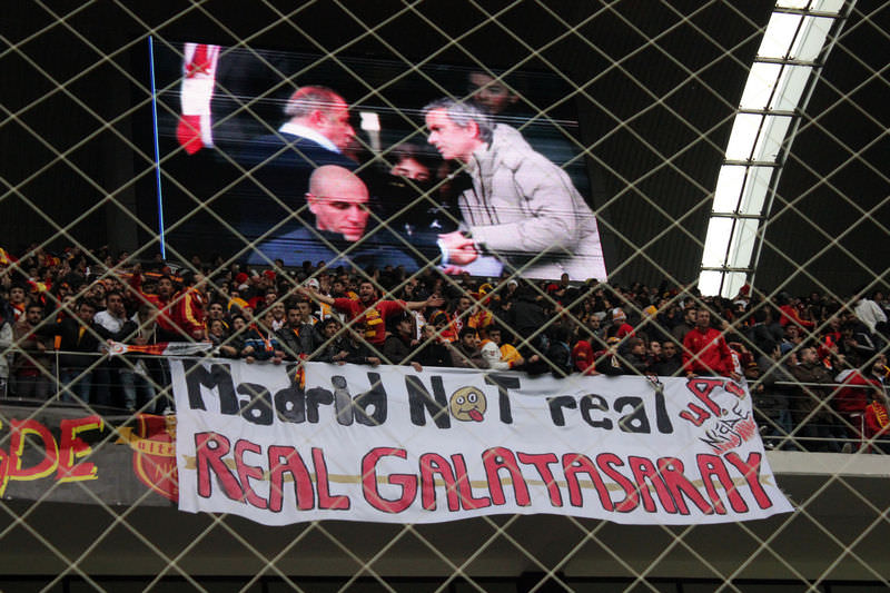 Galatasaray'ın Şampiyonlar Ligi'nde karşılaşacağı Real Madrid takımına pankartlı gönderme yapıldı. Sarı kırmızılı ekip taraftarları "Madrid Not Real Real Galatasaray" yazılı bir pankart açarak Jose Mourinho'ya gönderme yaptı...