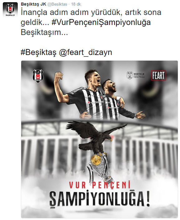 Beşiktaş ligin bitimine 2 hafta kala Fenerbahçe'nin puan kaybetmesinin ardından twitter hesabından 'İnançla adım adım yürüdük, artık sona geldik... Vur pençeni şampiyonluğa Beşiktaşım' şeklinde bir paylaşımda bulundu.