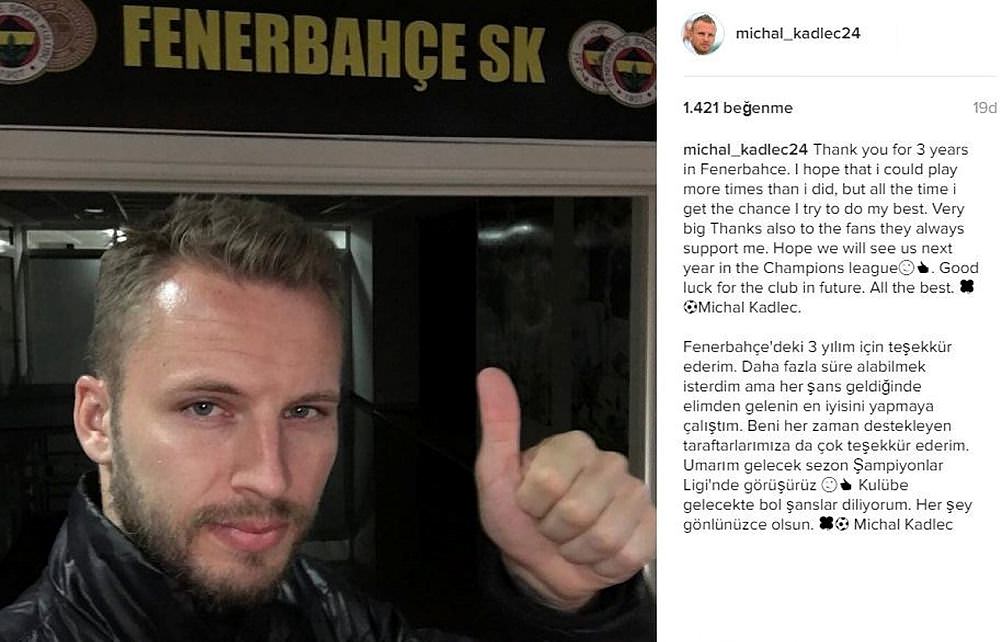 Tecrübeli defans oyuncusu Michal Kadlec, sarı-lacivertli kulübe yayınladığı mesajla veda etti. Kadlec, Instagram hesabından yaptığı açıklamada, "Fenerbahçe'deki 3 yılım için teşekkür ederim. Daha fazla süre alabilmek isterdim ama her şans geldiğinde elimden gelenin en iyisini yapmaya çalıştım. Beni her zaman destekleyen taraftarlarımıza da çok teşekkür ederim. Umarım gelecek sezon Şampiyonlar Ligi'nde görüşürüz. Kulübe gelecekte bol şanslar diliyorum. Her şey gönlünüzce olsun" dedi.