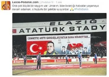 Japonya'ya transferi gundeme gelen Podolski sosyal medyadan cok anlamlı bir paylaşım yaptı. Elazığ macında şehit polis memuru Fethi Sekin icin acılan pankartı paylaşan Alman yıldız, resmin altına "Ona cok buyuk bir saygım var. Umarım bize bıraktığı hatıralar yaşamaya devam ederken, o huzurlu bir şekilde uyuyordur" dedi.