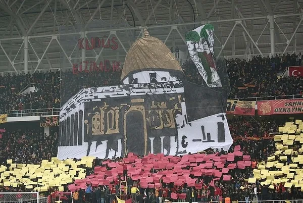 Süper Lig'in 16. haftasında yapılan Evkur Yeni Malatyaspor-Galatasaray karşılaşması öncesinde ev sahibi takım taraftarları Kudüs için 3 boyutlu koreografi gerçekleştirdi.
