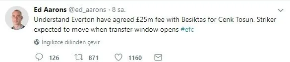 Aarons attığı tweet'le transferi duyururken Cenk Tosun'un 1 Ocak'ta ara transfer döneminin başlamasıyla Everton kadrosuna katılacağını ifade etti.