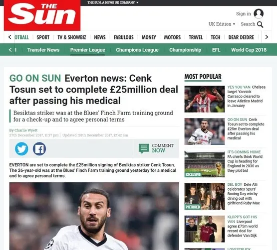 The Guardian'ın Everton ile Beşiktaş arasında Cenk Tosun'un transferi konusunda 25 milyon pound'a (28 milyon euro) anlaştığı iddiasının ardından diğer bir İngiliz gazetesi The Sun da yıldız golcünün İngiltere'de kontrolden geçtiğini iddia etti.